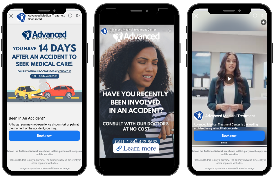We developed a targeted advertising campaign to attract patients who have been in car accidents. The campaign included Google Ads, Facebook Ads, and Instagram Ads, utilizing both compelling ad images and professionally produced videos to engage the target audience.