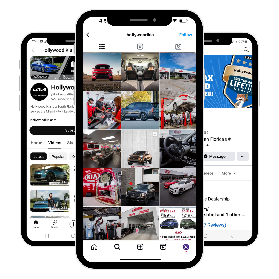 Located in Hollywood, Florida, Hollywood Kia is a distinguished dealership specializing in a diverse selection of new and pre-owned vehicles. Boost Miami partners with Hollywood Kia to elevate their marketing efforts across various fronts. We enhance their merchandising with detailed, high-quality photography that showcases their inventory in the best light. Our video production services create engaging content that highlights Hollywood Kia’s vehicles and dealership experience. Additionally, we manage their social media presence, crafting strategic campaigns to increase brand visibility and engage with their audience effectively.